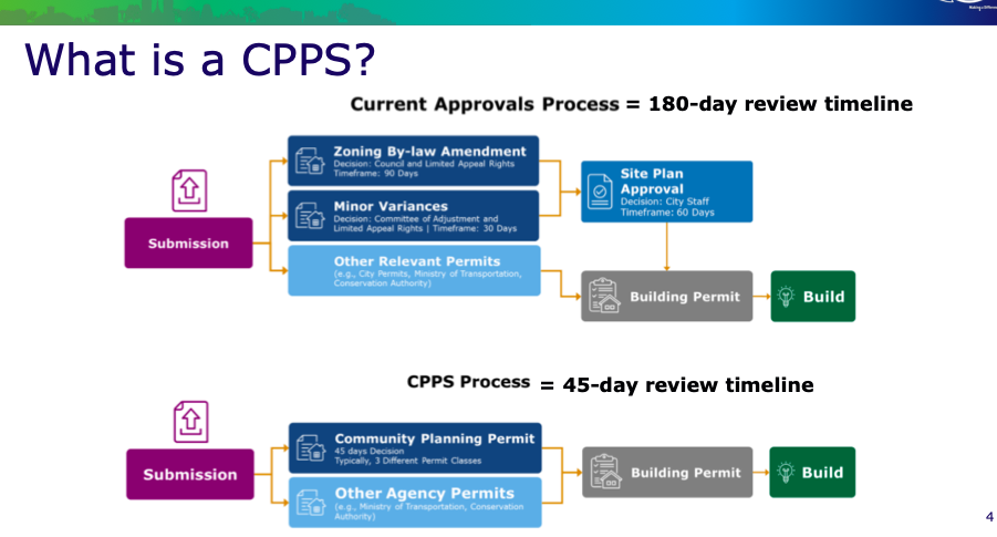 PS: You still need a building permit and draft plan for a subdivision, but this accelerates approval and allows more predictability. Revisions made since Jan include new notification requirements for class 2 and 3 permits, the Watson and Associates financial analysis was included (feeding the 33 per cent affordable number), the inclusion of 4 units as-of-right, and the need to include legal non-conforming uses.