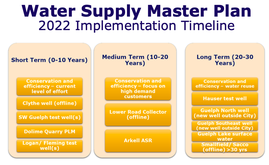 Galliher returns to talk master plans, which was last update in 2022 and meant to support water supply development to get Guelph to 2051. The MP will be re-opened in 2028 to account for new field work and will inform the City’s linear servicing MP.
