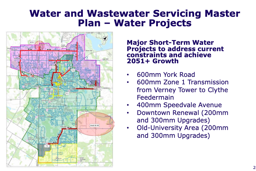 The Water and Wastewater Linear Servicing Master Plan focuses on taking the two master plans and working out the chronology of when projects need to be initiated. Water projects in the short-term: