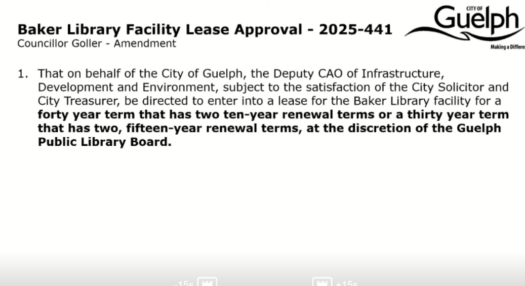 That on behalf of the City of Guelph, the Deputy CAO of Infrastructure, Development and Environment, subject to the satisfaction of the City Solicitor and City Treasurer, be directed to enter into a lease for the Baker Library facility for a thirty year term that has two, five-year renewal terms.