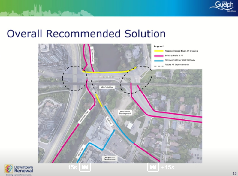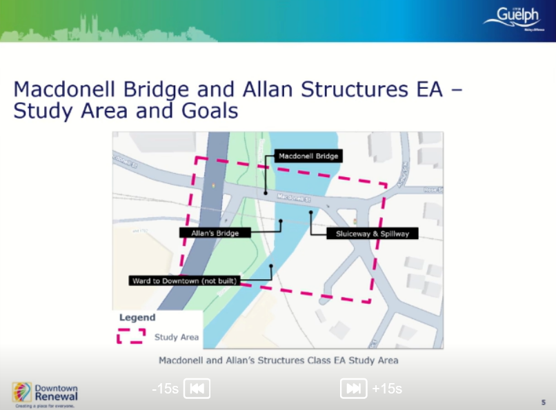 The five structures were evaluated as part of this study, the EA itself goes back to 2021 with the first phase and the opportunity statement. This study includes Macdonell Bridge, Allan’s Bridge, the sluiceway & spillway and the not yet built Ward-to-Downtown Bridge. Neither the Metrolinx Bridge or the GJR Bridge were part of this study.