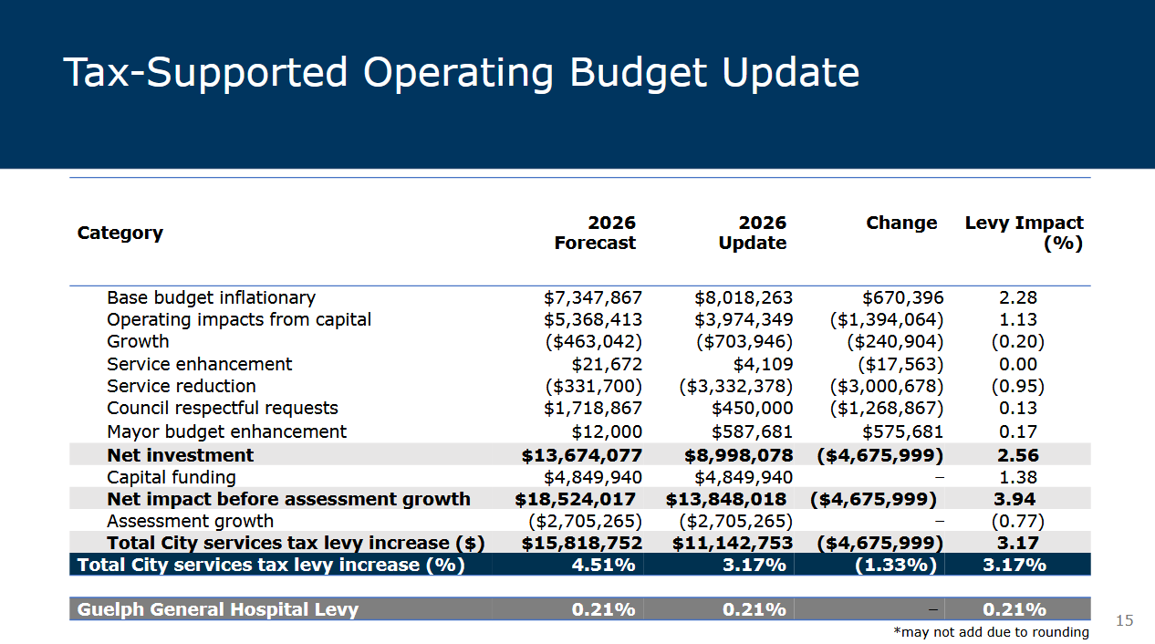 The 2026 budget confirmation process finally begins with the presentation from City of Guelph senior staff! You can click here for the amended agenda from City Hall, and you can click here for the Politico preview. For the complete blow-by-blow of today’s council meeting, you can follow along with the thread below, or you can watch the whole meeting for yourself by watching it on the City’s website here.