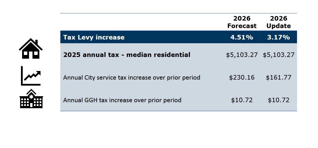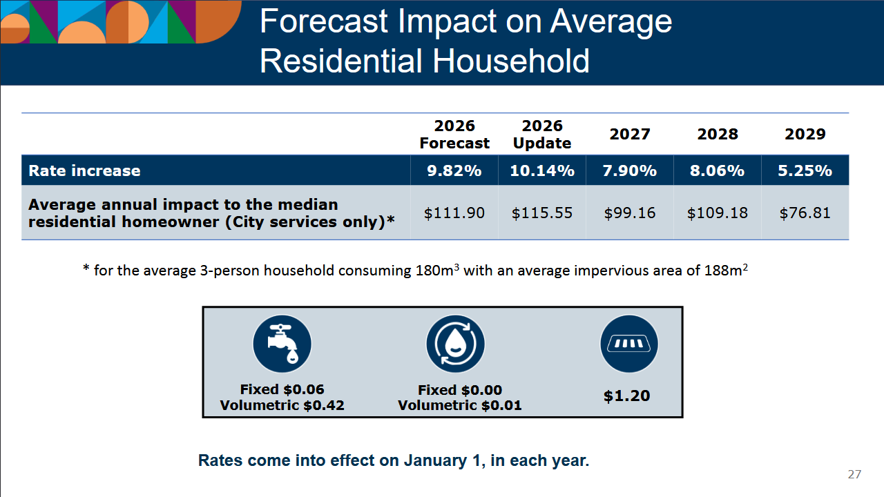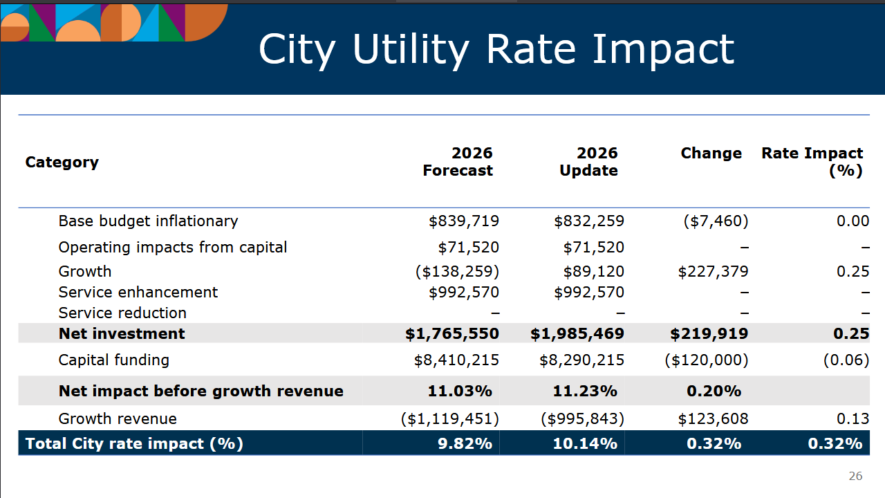 The 2026 investments included updated revenue projections for select departments, increase in Transit ridership, increased budget to tackle aging infrastructure, increased employee compensation and supplies. Increase in compensation of $2.9 million, plus about $700k for frontline emergency services’ mental health, but there will be some savings from the carbon tax being removed.