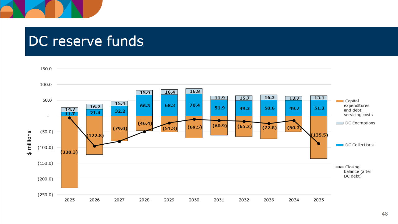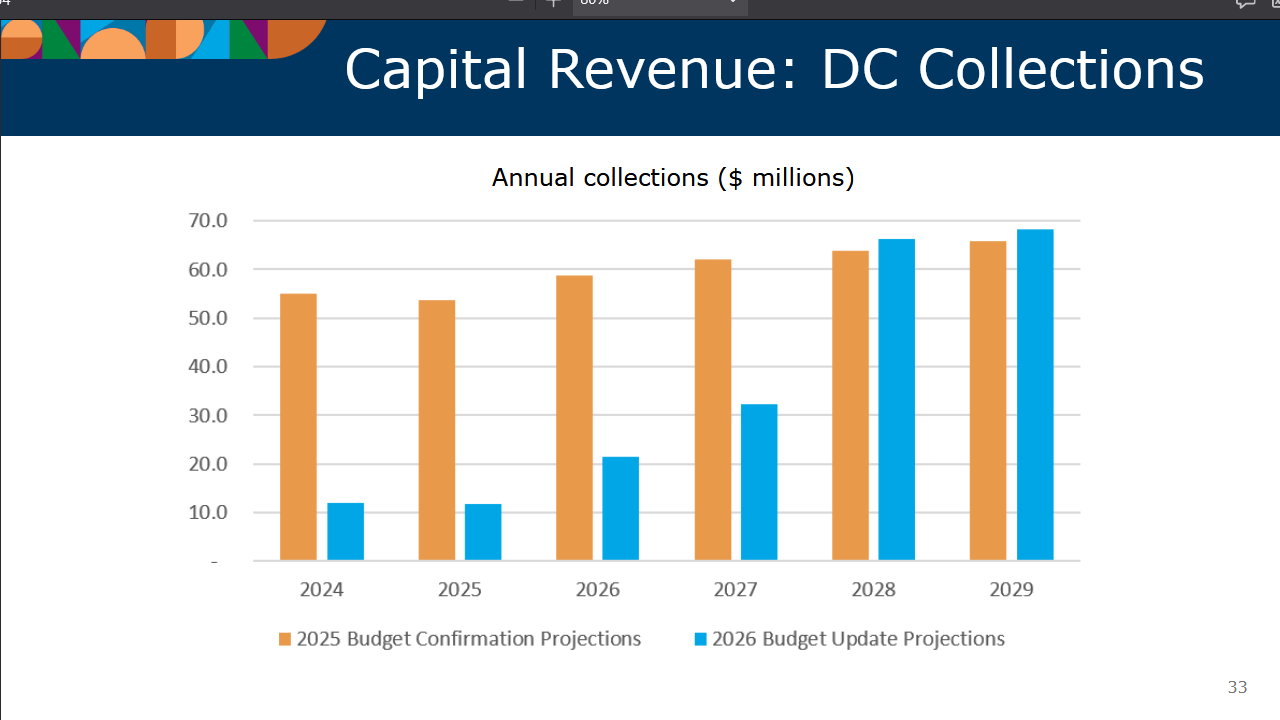 O’Dwyer is back to intro the Capital Budget. In 2025 a fully-funded capital budget and forecast was approved at council direction and the major change for 2026 has to do with DC collection (they’re lower than forecasted in the 2023 DC study.