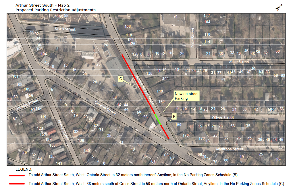 Before the closed session, there was one additional item put on the agenda by Mayor Guthrie, a spot in The Ward where staff posted new signs that reinforced parking restrictions on a portion of Arthur Street South near the site of a trio of small businesses including the Standing Room Only bar. For the last several years people have been parking along Arthur at this location despite the fact that Guelph’s on-street parking regulations barred it, and then several weeks ago new signs went up reintroducing people in the area to the rules of parking on this road.