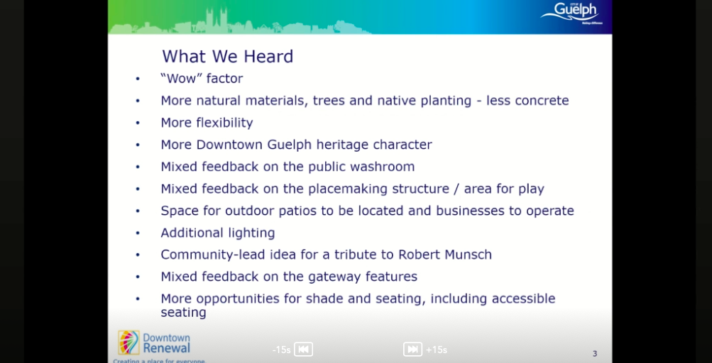 Lastly, Morgan Dandie. She notes some things in the drawings that need to be changed, like the Bank of Montreal, which is closing in the spring, and the placement of the stairs outside the CIBC. Also, she’s confused about having more events downtown without the installation of a visible 24/7 bathroom in the core. Guelph Labs noted the necessity of this feature and the washrooms in the new library will not be open 24/7.