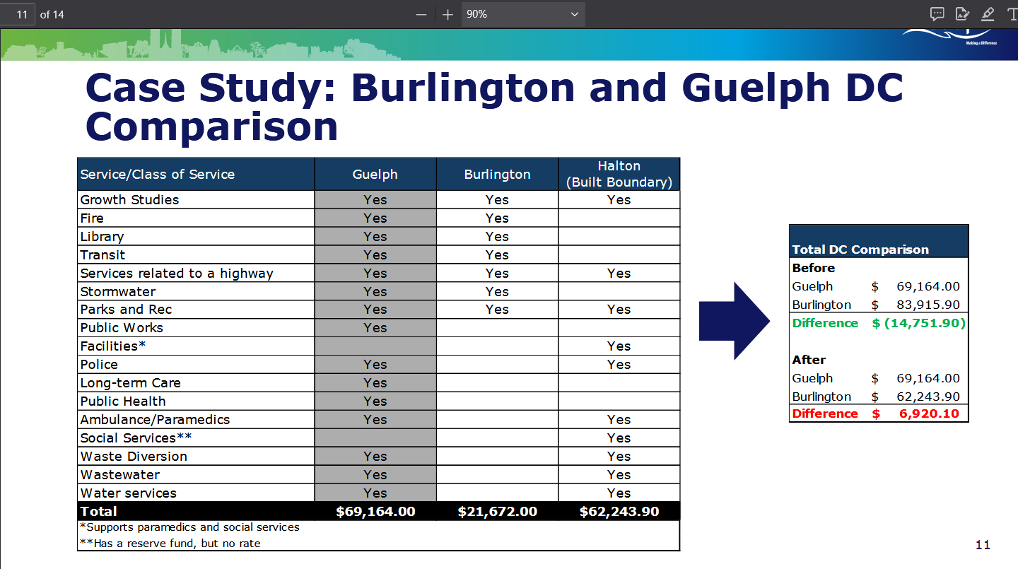 On Guelph Vs Burlington, O’Dwyer notes that Guelph has a single tier municipality carries an awful lot of the load on its own, while Burlington’s costs are partially covered by Halton Region. If Guelph implemented a blanket exemption similar to what Burlington was contemplating that would mean a $46 million shortfall would have to be made up somewhere, like a tax levy increase of 8.85 per cent.