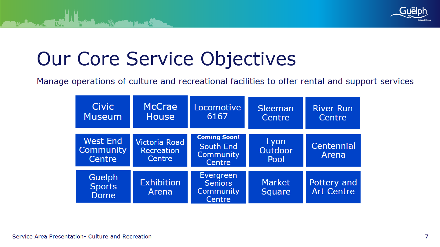 Evans says that they provide opportunities of participation in order to attract more people to facilities while promoting community and healthy living. There are 10 main facilities along recreation, museums, Sleeman Centre and the River Run. There are 90 FT staff members, 640 PT/casual and 500 active volunteers. About half the FT staff members have worked for the City for 10 years or more.