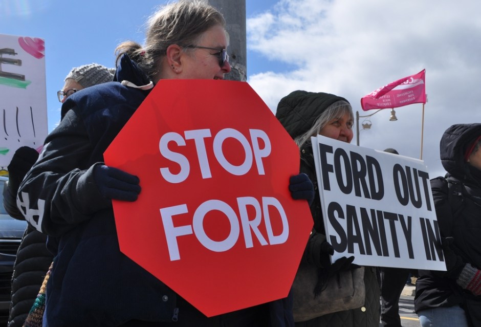 It was a cold and blistery day, but the outrage kept about 200 people warm as they stood on all corners at the intersection of Gordon and Wellington to make their displeasure known. The source of their disgruntlement is the Ontario government under Premier Doug Ford, and it encompassed a variety of issues from education to healthcare to affordability to democratic rights. Check out some the sights and cleverly written signs from the protest below.