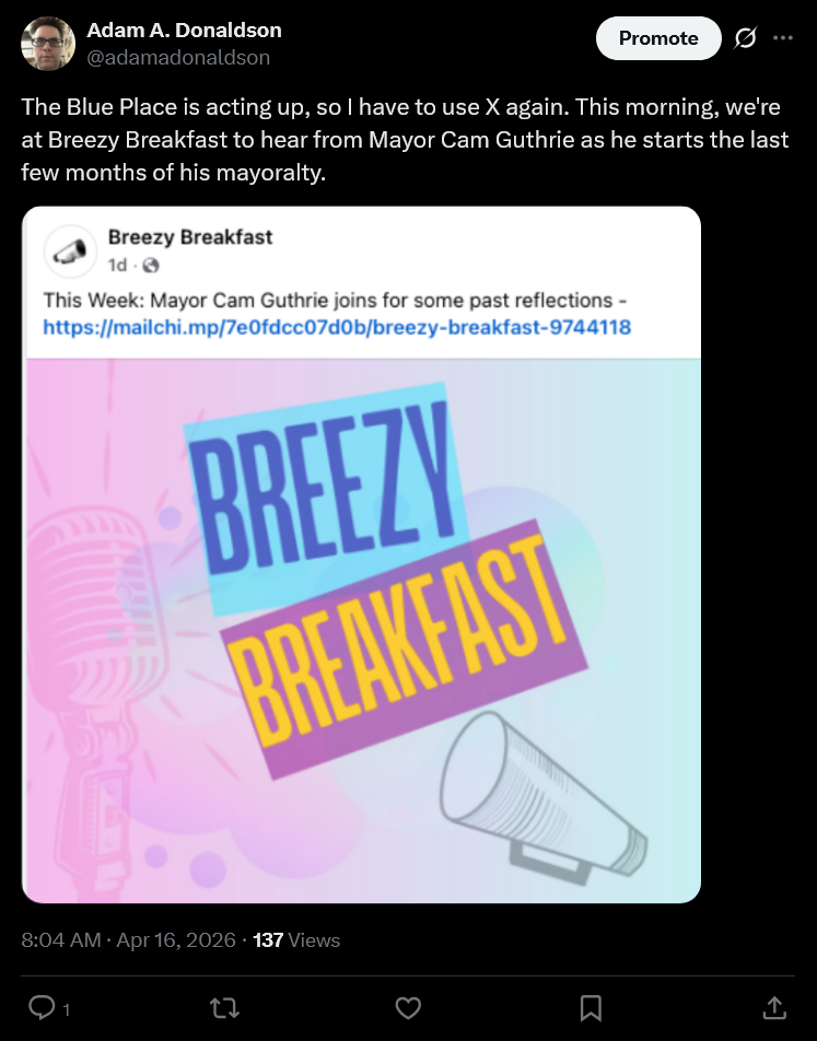 For the first time since announcing that he will not run for a fourth term to be mayor in this fall’s municipal election, Cam Guthrie took questions about it from the people. Why did he decide that 12 years was enough? When did he decide? What are his greatest successes and frustrations while in office? The people gathered for this morning’s Breezy Breakfast wanted to know and they had many more questions for the outgoing mayor to answer. Here’s the recap…