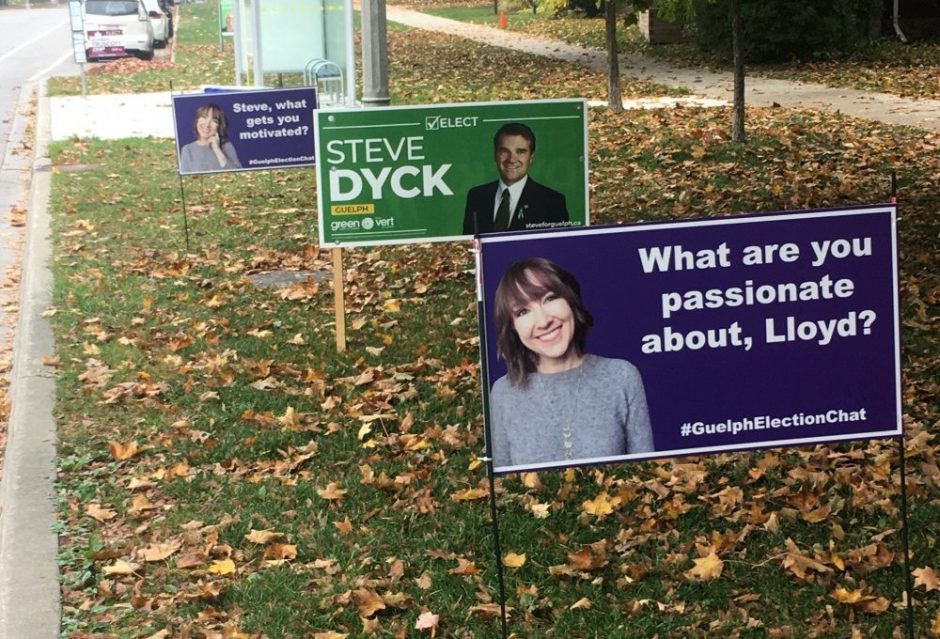 “What are you passionate about, Lloyd?” “Steve, what gets you motivated?” A picture shared with Guelph Politico on Monday morning showed a pair of unusual signs joining the usual election sign menagerie on a major street corner in Guelph. Who designed them? Who paid for them? And who put them there? The mystery remains. Continue reading “Are Weird Message Signs the Robocalls of 2019?”