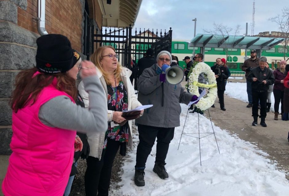 Over 70 people joined local labour organizers to mark the death last month of a 62-year-old security guard at Guelph Central Station. After leaving a wreath and tying green ribbons outside the station in memorial to Mario Ruffolo, City of Guelph labour leaders told the crowd that Ruffolo’s death is a reminder that more needs to be done for workers, and that more needs to be done for people suffering from mental illness. Continue reading “Big Turnout for a Memorial to Fallen Security Guard”