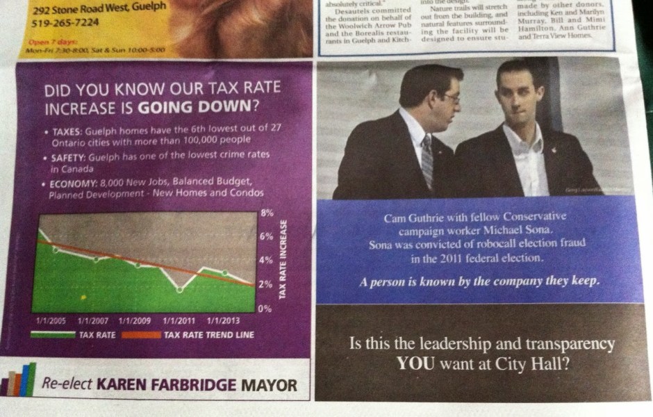 It wasn’t exactly a “whodunnit?” on par with Agatha Christie, but when the Guelph Tribune appeared on doorsteps across the Royal City Thursday, one ad in particular caught their eye, and it was unknown who might have placed such a provocative bit of negative advertising. Continue reading “Farbridge Campaign Takes Credit For Controversial Ad”