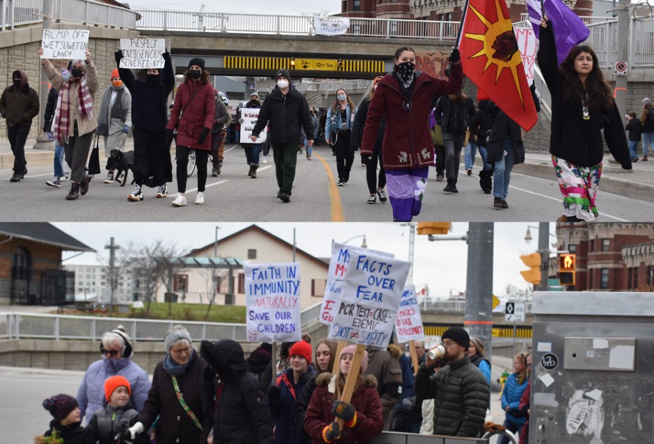 It was a grey and chilly Saturday afternoon, the downtown streets had the usual kinds of people milling about grabbing a bit or doing a bit of shopping, but the real action was political this weekend. At noon, it was the supporters of the First Nations land defenders in the Wet’suwet’en territory, and then later it was time for the Guelph Freedom Rally, one of the largest local gatherings yet for the COVID-19 skeptical. Continue reading “A Tale of Two Protests: Saturday Marches for Indigenous Rights and Freedom (!)”